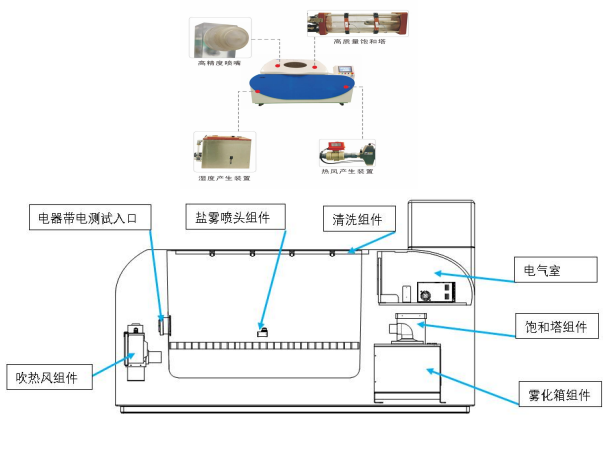 (4) 盐雾功能,进行盐雾功能时外置盐水箱里的溶液由泵运送到喷嘴。压缩空气在通往喷嘴的过程中经饱和塔湿润和加热。溶液经喷嘴雾化喷出;