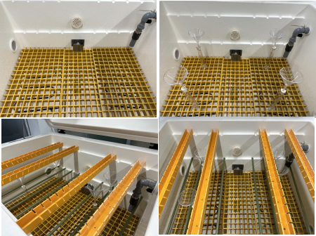 (1) 试验室结构 | 设备采用玻璃钢整机一体结构设计,玻璃钢的优点有:1.强度高,它能够承受较大的载荷和压力,不易变形和破裂 ;2.具有优异耐腐蚀性,能够抵抗酸、碱、盐和大部分化学物质的侵蚀 ;3.优良绝缘性能,能够抵抗电和热的传导,以提供绝缘和防护 ;4.具有良好的耐候性能,能够抵抗紫外线、氧化和高温的影响。它不易老化和退色,保持长久的外观和性能 ;5.具有良好的隔热性能; 设备底部采用不锈钢焊接成龙骨支架,在底部框架上安装承重福马脚轮;设备顶部制作为斜顶,顶部夹角 110 °有效避免冷凝水滴落到样品表面;外置盐水箱位于试验室右后侧; |